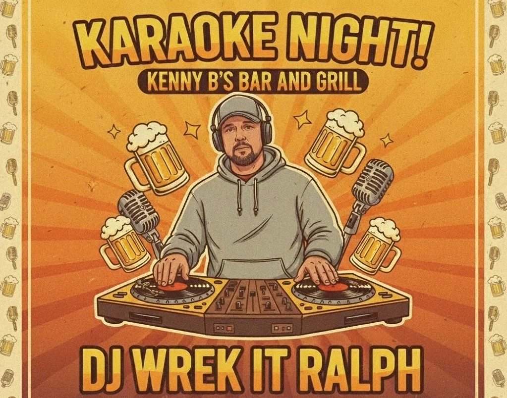 Karaoke night at Kenny B’s Bar & Grill lights up every Friday at 9 PM with DJ Wrek It Ralph spinning the tracks, creating a lively, welcoming scene. Whether you’re belting out classics, tackling the latest hits, or cheering on friends, the crowd’s energy and DJ Ralph’s seamless mix of music keep the night rolling. Enjoy great drink specials, friendly service, and a relaxed atmosphere that makes it easy to sing your heart out or simply soak up the fun. Bring your friends, warm up those vocal cords, and make Friday nights the highlight of your week at Kenny B’s.